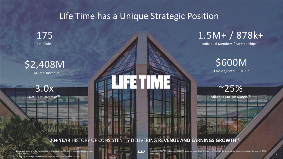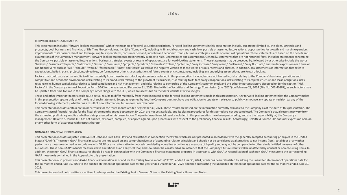 L E G A L FORWARD-LOOKING STATEMENTS This presentation includes “forward-looking statements” within the meaning of federal securities regulations. Forward-looking statements in this presentation include, but are not limited to, the plans, strategies and prospects, both business and financial, of Life Time Group Holdings, Inc. (the “Company”), including its financial outlook and cash flow, possible or assumed future actions, opportunities for growth and margin expansion, improvements to its balance sheet and leverage, capital expenditures, consumer demand, industry and economic trends, business strategies, events or results of operations. These statements are based on the beliefs and assumptions of the Company’s management. Forward-looking statements are inherently subject to risks, uncertainties and assumptions. Generally, statements that are not historical facts, including statements concerning the Company’s possible or assumed future actions, business strategies, events or results of operations, are forward-looking statements. These statements may be preceded by, followed by or otherwise include the words “believes,” “assumes,” “expects,” “anticipates,” “intends,” “continues,” “projects,” “predicts,” “estimates,” “plans,” “potential,” “may increase,” “may result,” “will result,” “may fluctuate,” and similar expressions or future or conditional verbs such as “will,” “should,” “would,” “foreseeable,” “may,” and “could” as well as the negative version of these words or similar terms and phrases. In addition, any statements or information that refer to expectations, beliefs, plans, projections, objectives, performance or other characterizations of future events or circumstances, including any underlying assumptions, are forward-looking. Factors that could cause actual results to differ materially from those forward-looking statements included in this presentation include, but are not limited to, risks relating to the Company’s business operations and competitive and economic environment, risks relating to its brand, risks relating to the growth of its business, risks relating to its technological operations, risks relating to its capital structure and lease obligations, risks relating to its human capital, risks relating to legal compliance and risk management, and risks relating to ownership of the Company’s common stock and the other important factors discussed under the caption “Risk Factors” in the Company’s Annual Report on Form 10-K for the year ended December 31, 2023, filed with the Securities and Exchange Commission (the “SEC”) on February 28, 2024 (File No. 001-40887), as such factors may be updated from time to time in the Company’s other filings with the SEC, which are accessible on the SEC’s website at www.sec.gov. These and other important factors could cause actual results to differ materially from those indicated by the forward-looking statements made in this presentation. Any forward-looking statement that the Company makes in this presentation speaks only as of the date of such statement. Except as required by law, the Company does not have any obligation to update or revise, or to publicly announce any update or revision to, any of the forward-looking statements, whether as a result of new information, future events or otherwise. This presentation includes certain preliminary results for the three months ended September 30, 2024. These results are based on the information currently available to the Company as of the date of this presentation. The Company's actual financial results for the fiscal three months ended September 30, 2024 are not yet available, and its closing procedures for this period are not yet completed. The Company's actual results may vary from the estimated preliminary results and other data presented in this presentation. The preliminary financial results included in this presentation have been prepared by, and are the responsibility of, the Company's management. Deloitte & Touche LLP has not audited, reviewed, compiled, or applied agreed-upon procedures with respect to the preliminary financial results. Accordingly, Deloitte & Touche LLP does not express an opinion or any other form of assurance with respect thereto. NON-GAAP FINANCIAL INFORMATION This presentation includes Adjusted EBITDA, Net Debt and Free Cash Flow and calculations in connection therewith, which are not presented in accordance with the generally accepted accounting principles in the United States (“GAAP”). These non-GAAP financial measures are not based on any comprehensive set of accounting rules or principles and should not be considered as alternatives to net income (loss), total debt or any other performance measures derived in accordance with GAAP or as an alternative to net cash provided by operating activities as a measure of liquidity and may not be comparable to other similarly titled measures of other businesses. These non-GAAP financial measures have limitations as an analytical tool, and should not be construed as an inference that the Company’s future results will be unaffected by unusual or non-recurring items. In addition, these non-GAAP financial measures should be read in conjunction with the Company’s financial statements prepared in accordance with GAAP. A reconciliation of each non-GAAP measure to the corresponding GAAP measure is contained in the Appendix to this presentation. This presentation also presents non-GAAP financial information as of and for the trailing twelve months (“TTM”) ended June 30, 2024, which has been calculated by adding the unaudited statement of operations data for the six months ended June 30, 2024 to the audited statement of operations data for the year ended December 31, 2023 and then subtracting the unaudited statement of operations data for the six months ended June 30, 2023. This presentation shall not cons