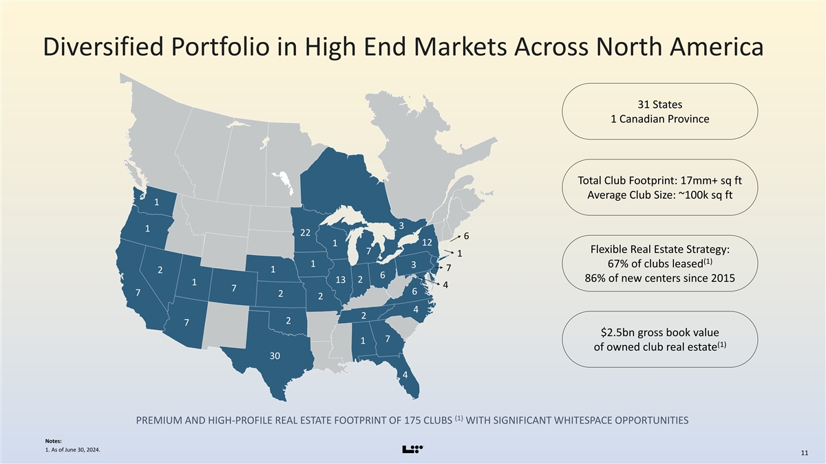 Life Time has a Unique Strategic Position 175 1.5M+ / 878k+ (1) (1) Total Clubs Individual Members / Memberships $600M $2,408M (3) TTM Adjusted EBITDA TTM Total Revenue 3.0x ~25% (1) (3) Net Debt Leverage Adjusted EBITDA Margin (2) 20+ YEAR HISTORY OF CONSISTENTLY DELIVERING REVENUE AND EARNINGS GROWTH Notes: Metrics as of or for the twelve months ended June 30, 2024, unless otherwise stated. 3. Adjusted EBITDA and Adjusted EBITDA margin are non-GAAP measures. Please see the appendix for a reconciliation to the nearest GAAP 1. As of June 30, 2024. measures. 10 10 2. Company did not grow revenue and Adjusted EBITDA in 2020 due to COVID. 81nidZpGqzkSDMpD