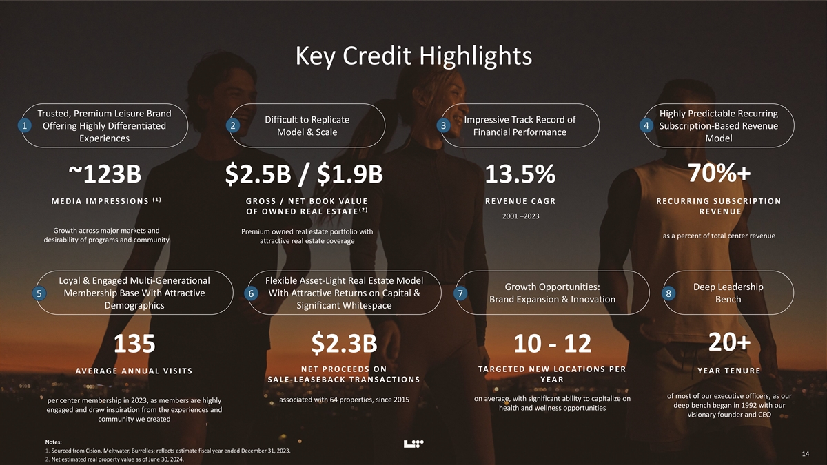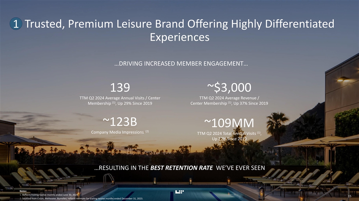 Key Credit Highlights Trusted, Premium Leisure Brand Highly Predictable Recurring Difficult to Replicate Impressive Track Record of 1 Offering Highly Differentiated 2 3 4 Subscription-Based Revenue Model & Scale Financial Performance Experiences Model 70%+ ~123B 13.5% $2.5B / $1.9B ( 1 ) M E D I A I M P R E S S I O N S G R O S S / N E T B O O K VA L U E R E V E N U E C A G R R E C U R R I N G S U B S C R I P T I O N ( 2 ) O F O W N E D R E A L E S TAT E R E V E N U E 2001 –2023 Growth across major markets and Premium owned real estate portfolio with as a percent of total center revenue desirability of programs and community attractive real estate coverage Loyal & Engaged Multi-Generational Flexible Asset-Light Real Estate Model Growth Opportunities: Deep Leadership Membership Base With Attractive With Attractive Returns on Capital & 5 6 7 8 Brand Expansion & Innovation Bench Demographics Significant Whitespace 20+ 135 $2.3B 10 - 12 N E T P R O C E E D S O N TA R G E T E D N E W L O C AT I O N S P E R Y E A R T E N U R E AV E R A G E A N N U A L V I S I T S S A L E - L E A S E B A C K T R A N S A C T I O N S Y E A R of most of our executive officers, as our on average, with significant ability to capitalize on associated with 64 properties, since 2015 per center membership in 2023, as members are highly deep bench began in 1992 with our health and wellness opportunities engaged and draw inspiration from the experiences and visionary founder and CEO community we created Notes: 1. Sourced from Cision, Meltwater, Burrelles; reflects estimate fiscal year ended December 31, 2023. 14 14 2. Net estimated real property value as of June 30, 2024. 81nidZpGqzkSDMpD