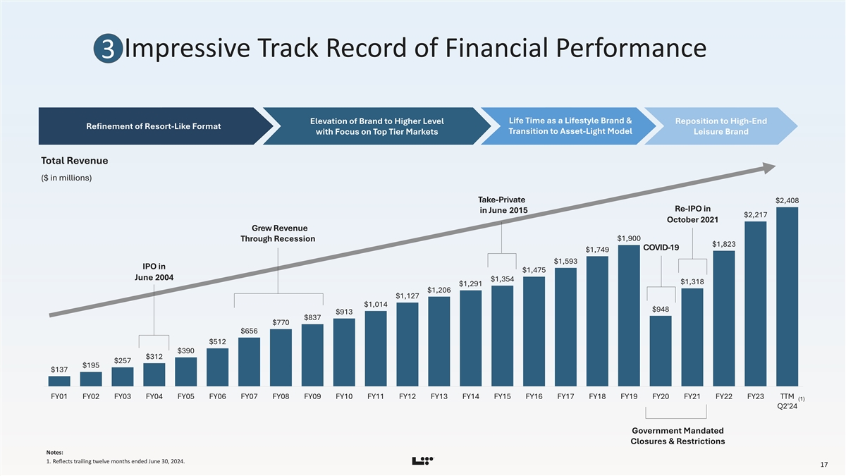 BEAVERTON, OR IRVINE, CA 2 Difficult to Replicate Model & Scale (1) HIGH-PROFILE PREMIUM REAL ESTATE FOOTPRINT OF 175 CLUBS WITH SIGNIFICANT PORTFOLIO OF OWNED REAL ESTATE AND ATTRACTIVE REAL ESTATE COVERAGE $2.5B $1.9B SHENANDOAH, TX CHICAGO, IL (2) (2) Gross Book Value Net Book Value 2.1x 1.6x (3) (3) Pro Forma Real Estate Coverage Pro Forma Real Estate Coverage (Gross Book Value) (Net Book Value) SCOTTSDALE, AZ NEW YORK, NY Notes: 3. Pro Forma real estate coverage calculated by dividing Revolver, TLB & other secured debt outstanding by net estimated property value (on a gross book value basis and net book value basis, respectively). 1. As of June 30, 2024. 16 16 2. Represents net estimated real property value as of June 30,2024. 81nidZpGqzkSDMpD