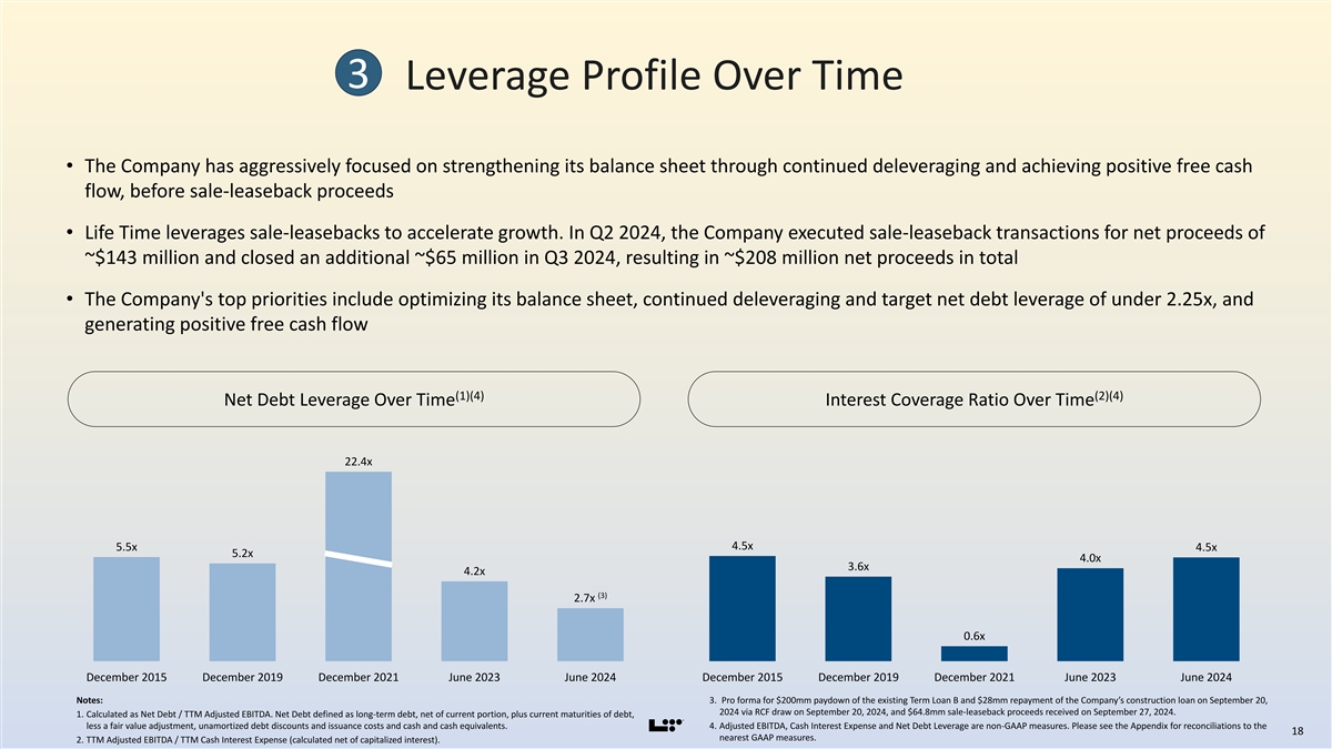 3 Leverage Profile Over Time • The Company has aggressively focused on strengthening its balance sheet through continued deleveraging and achieving positive free cash flow, before sale-leaseback proceeds • Life Time leverages sale-leasebacks to accelerate growth. In Q2 2024, the Company executed sale-leaseback transactions for net proceeds of ~$143 million and closed an additional ~$65 million in Q3 2024, resulting in ~$208 million net proceeds in total • The Company's top priorities include optimizing its balance sheet, continued deleveraging and target net debt leverage of under 2.25x, and generating positive free cash flow (1)(4) (2)(4) Net Debt Leverage Over Time Interest Coverage Ratio Over Time 22.4x 4.5x 5.5x 4.5x 5.2x 4.0x 3.6x 4.2x (3) 2.7x 0.6x December 2015 December 2019 December 2021 June 2023 June 2024 December 2015 December 2019 December 2021 June 2023 June 2024 Notes: 3. Pro forma for $200mm paydown of the existing Term Loan B and $28mm repayment of the Company’s construction loan on September 20, 2024 via RCF draw on September 20, 2024, and $64.8mm sale-leaseback proceeds received on September 27, 2024. 1. Calculated as Net Debt / TTM Adjusted EBITDA. Net Debt defined as long-term debt, net of current portion, plus current maturities of debt, less a fair value adjustment, unamortized debt discounts and issuance costs and cash and cash equivalents. 4. Adjusted EBITDA, Cash Interest Expense and Net Debt Leverage are non-GAAP measures. Please see the Appendix for reconciliations to the 18 nearest GAAP measures. 2. TTM Adjusted EBITDA / TTM Cash Interest Expense (calculated net of capitalized interest). 81nidZpGqzkSDMpD