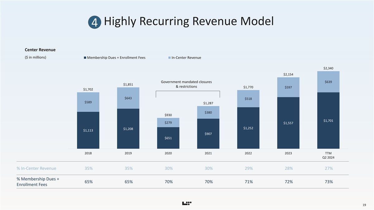Highly Recurring Revenue Model 4 Center Revenue ($ in millions) Membership Dues + Enrollment Fees In-Center Revenue $2,340 $2,154 $639 Government mandated closures $1,851 & restrictions $1,770 $597 $1,702 $643 $518 $589 $1,287 $380 $930 $1,701 $279 $1,557 $1,252 $1,208 $1,113 $907 $651 2018 2019 2020 2021 2022 2023 TTM Q2 2024 % In-Center Revenue 35% 35% 30% 30% 29% 28% 27% % Membership Dues + 65% 65% 70% 70% 71% 72% 73% Enrollment Fees 19 81nidZpGqzkSDMpD