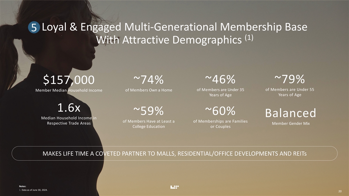 Loyal & Engaged Multi-Generational Membership Base 5 (1) With Attractive Demographics ~79% ~46% ~74% $157,000 of Members are Under 55 of Members are Under 35 of Members Own a Home Member Median Household Income Years of Age Years of Age 1.6x ~59% ~60% Balanced Median Household Income in of Members Have at Least a of Memberships are Families Respective Trade Areas Member Gender Mix College Education or Couples MAKES LIFE TIME A COVETED PARTNER TO MALLS, RESIDENTIAL/OFFICE DEVELOPMENTS AND REITs Notes: 1. Data as of June 30, 2024. 20 20 81nidZpGqzkSDMpD