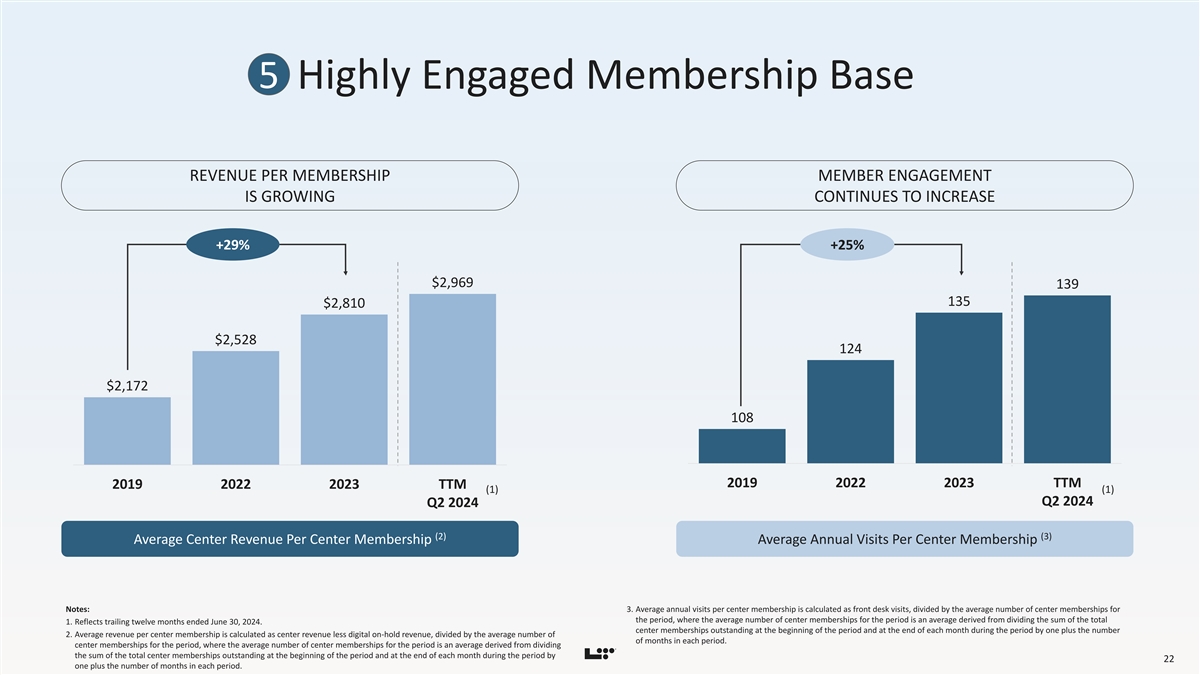 5 Highly Engaged Membership Base REVENUE PER MEMBERSHIP MEMBER ENGAGEMENT IS GROWING CONTINUES TO INCREASE +29% +25% $2,969 139 135 $2,810 $2,528 124 $2,172 108 2019 2022 2023 TTM 2019 2022 2023 TTM (1) (1) Q2 2024 Q2 2024 (2) (3) Average Center Revenue Per Center Membership Average Annual Visits Per Center Membership Notes: 3. Average annual visits per center membership is calculated as front desk visits, divided by the average number of center memberships for the period, where the average number of center memberships for the period is an average derived from dividing the sum of the total 1. Reflects trailing twelve months ended June 30, 2024. center memberships outstanding at the beginning of the period and at the end of each month during the period by one plus the number 2. Average revenue per center membership is calculated as center revenue less digital on-hold revenue, divided by the average number of of months in each period. center memberships for the period, where the average number of center memberships for the period is an average derived from dividing the sum of the total center memberships outstanding at the beginning of the period and at the end of each month during the period by 22 one plus the number of months in each period. 81nidZpGqzkSDMpD