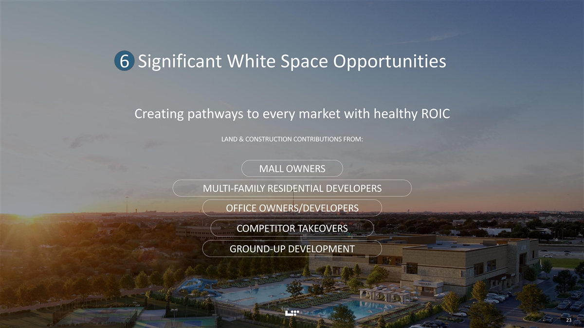 Significant White Space Opportunities 6 Creating pathways to every market with healthy ROIC LAND & CONSTRUCTION CONTRIBUTIONS FROM: MALL OWNERS MULTI-FAMILY RESIDENTIAL DEVELOPERS OFFICE OWNERS/DEVELOPERS COMPETITOR TAKEOVERS GROUND-UP DEVELOPMENT 23 23 81nidZpGqzkSDMpD