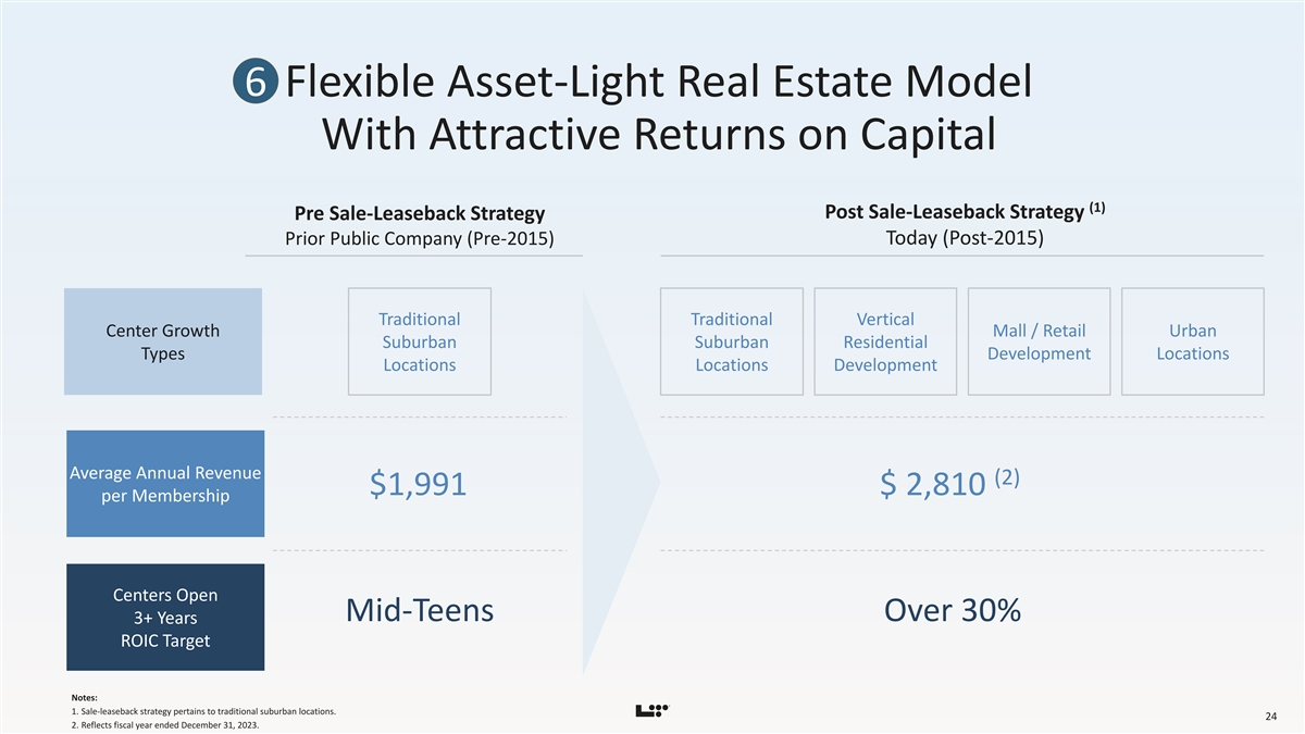 6 Flexible Asset-Light Real Estate Model With Attractive Returns on Capital (1) Post Sale-Leaseback Strategy Pre Sale-Leaseback Strategy Today (Post-2015) Prior Public Company (Pre-2015) Traditional Traditional Vertical Center Growth Mall / Retail Urban Suburban Suburban Residential Types Development Locations Locations Locations Development Average Annual Revenue (2) $1,991 $ 2,810 per Membership Centers Open Mid-Teens Over 30% 3+ Years ROIC Target Notes: 1. Sale-leaseback strategy pertains to traditional suburban locations. 24 2. Reflects fiscal year ended December 31, 2023. 81nidZpGqzkSDMpD