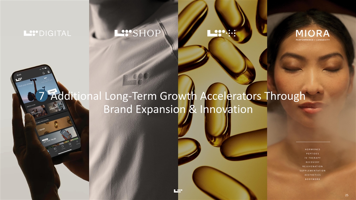 7 Additional Long-Term Growth Accelerators Through Brand Expansion & Innovation H O R M O N E S P E P T I D E S I V T H E R A P Y R E C O V E R Y R E J U V E N A T I O N S U P P L E M E N T A T I O N A E S T H E T I C S B O D Y W O R K 25 25 81nidZpGqzkSDMpD