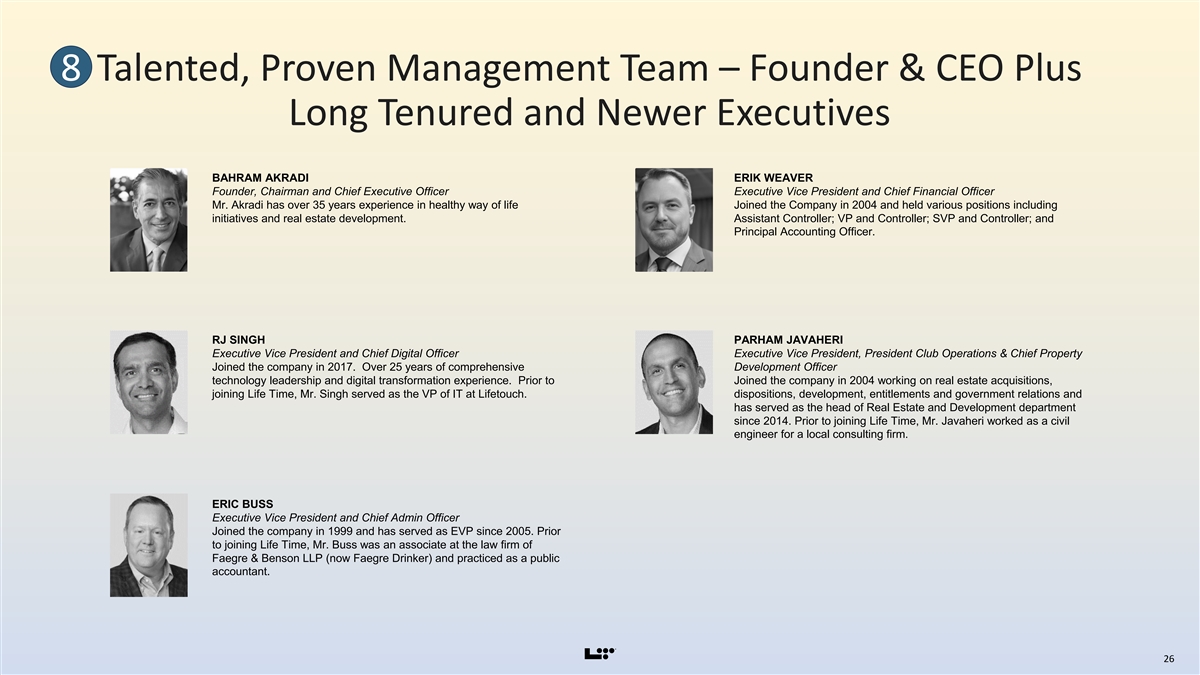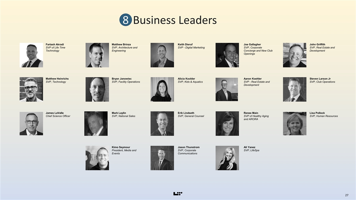 8 Talented, Proven Management Team – Founder & CEO Plus Long Tenured and Newer Executives BAHRAM AKRADI ERIK WEAVER Founder, Chairman and Chief Executive Officer Executive Vice President and Chief Financial Officer Mr. Akradi has over 35 years experience in healthy way of life Joined the Company in 2004 and held various positions including initiatives and real estate development. Assistant Controller; VP and Controller; SVP and Controller; and Principal Accounting Officer. RJ SINGH PARHAM JAVAHERI Executive Vice President and Chief Digital Officer Executive Vice President, President Club Operations & Chief Property Joined the company in 2017. Over 25 years of comprehensive Development Officer technology leadership and digital transformation experience. Prior to Joined the company in 2004 working on real estate acquisitions, joining Life Time, Mr. Singh served as the VP of IT at Lifetouch. dispositions, development, entitlements and government relations and has served as the head of Real Estate and Development department since 2014. Prior to joining Life Time, Mr. Javaheri worked as a civil engineer for a local consulting firm. ERIC BUSS Executive Vice President and Chief Admin Officer Joined the company in 1999 and has served as EVP since 2005. Prior to joining Life Time, Mr. Buss was an associate at the law firm of Faegre & Benson LLP (now Faegre Drinker) and practiced as a public accountant. 26 81nidZpGqzkSDMpD