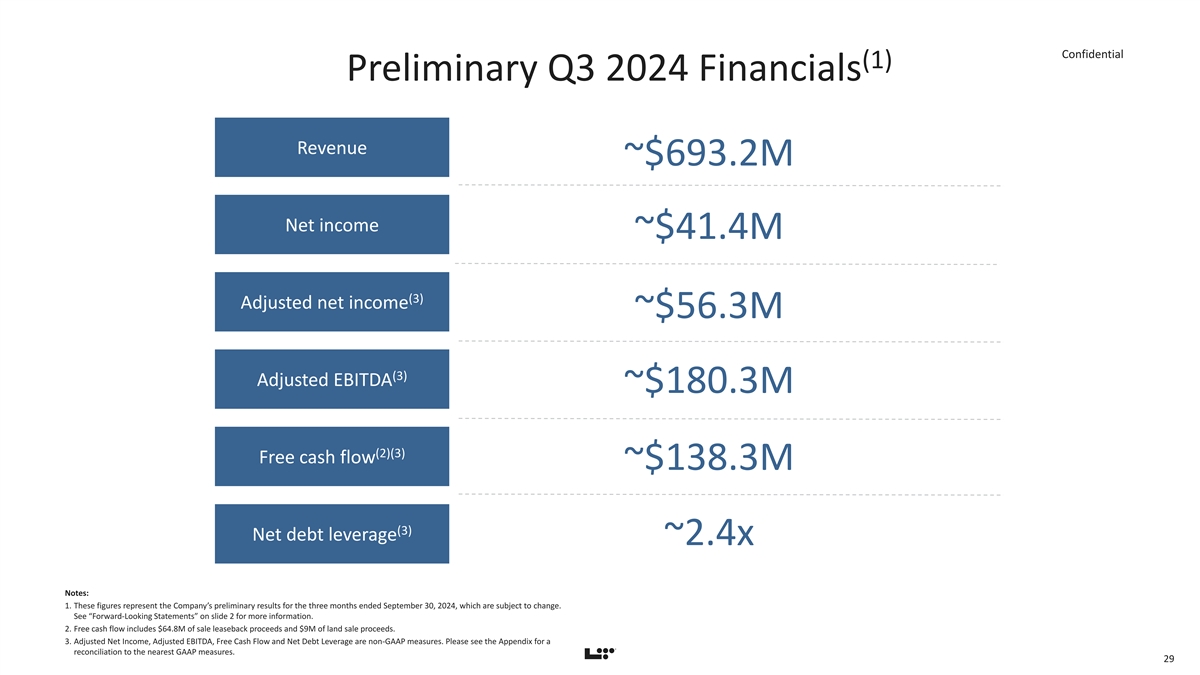 Confidential (1) Preliminary Q3 2024 Financials Revenue ~$693.2M Net income ~$41.4M (3) Adjusted net income ~$56.3M (3) Adjusted EBITDA ~$180.3M (2)(3) Free cash flow ~$138.3M (3) Net debt leverage ~2.4x Notes: 1. These figures represent the Company’s preliminary results for the three months ended September 30, 2024, which are subject to change. See “Forward-Looking Statements” on slide 2 for more information. 2. Free cash flow includes $64.8M of sale leaseback proceeds and $9M of land sale proceeds. 3. Adjusted Net Income, Adjusted EBITDA, Free Cash Flow and Net Debt Leverage are non-GAAP measures. Please see the Appendix for a reconciliation to the nearest GAAP measures. 29 81nidZpGqzkSDMpD