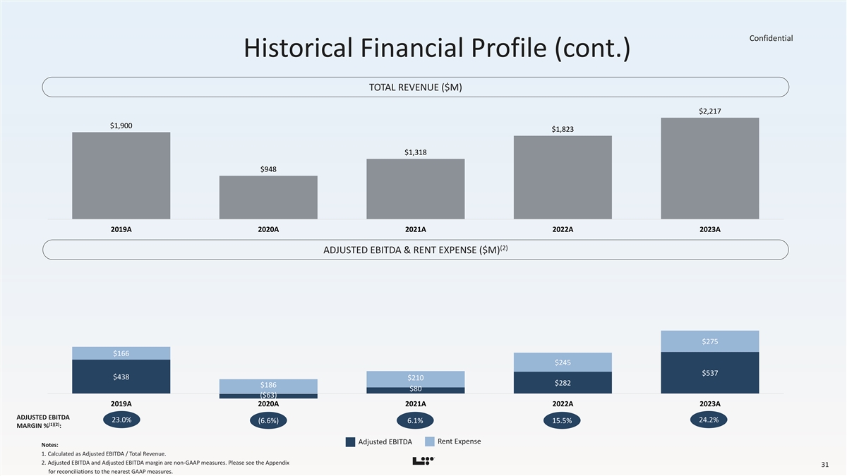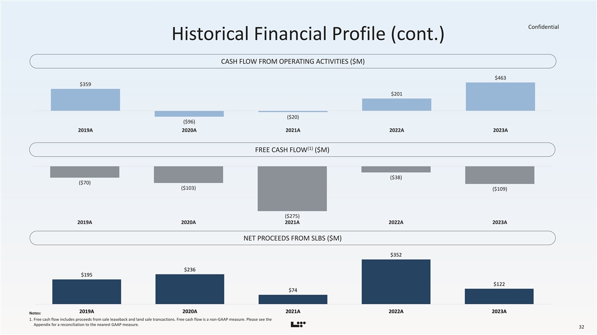 Confidential Historical Financial Profile (cont.) TOTAL REVENUE ($M) $2,217 $1,900 $1,823 $1,318 $948 2019A 2020A 2021A 2022A 2023A (2) ADJUSTED EBITDA & RENT EXPENSE ($M) $275 $166 $245 $537 $438 $210 $282 $186 $80 ($63) 2019A 2020A 2021A 2022A 2023A ADJUSTED EBITDA 23.0% 24.2% (6.6%) 6.1% 15.5% (1)(2) MARGIN % : Rent Expense Adjusted EBITDA Notes: 1. Calculated as Adjusted EBITDA / Total Revenue. 2. Adjusted EBITDA and Adjusted EBITDA margin are non-GAAP measures. Please see the Appendix 31 for reconciliations to the nearest GAAP measures. 81nidZpGqzkSDMpD