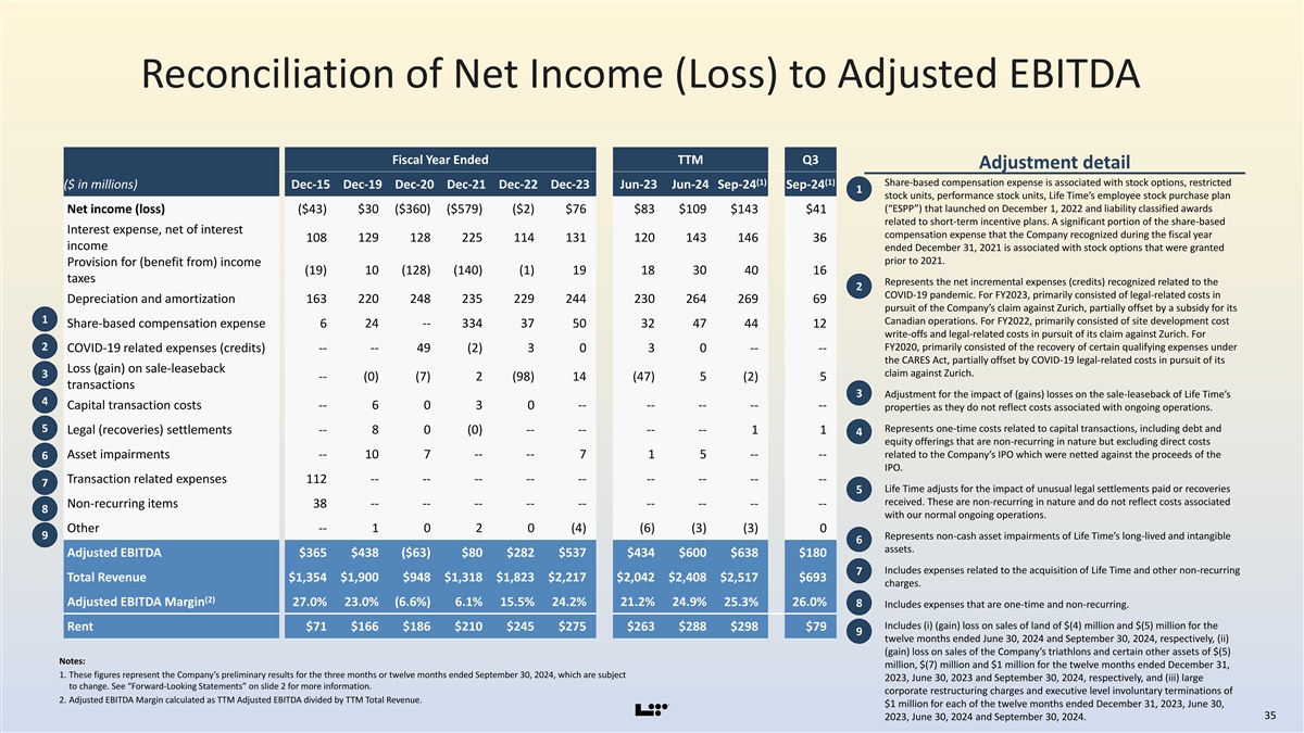 Reconciliation of Net Income (Loss) to Adjusted EBITDA Fiscal Year Ended TTM Q3 Adjustment detail (1) (1) 1. Share-based compensation expense is associated with stock options, restricted ($ in millions) Dec-15 Dec-19 Dec-20 Dec-21 Dec-22 Dec-23 Jun-23 Jun-24 Sep-24 Sep-24 1 stock units, performance stock units, Life Time’s employee stock purchase plan (“ESPP”) that launched on December 1, 2022 and liability classified awards Net income (loss) ($43) $30 ($360) ($579) ($2) $76 $83 $109 $143 $41 related to short-term incentive plans. A significant portion of the share-based Interest expense, net of interest compensation expense that the Company recognized during the fiscal year 108 129 128 225 114 131 120 143 146 36 income ended December 31, 2021 is associated with stock options that were granted prior to 2021. Provision for (benefit from) income (19) 10 (128) (140) (1) 19 18 30 40 16 taxes 2. Represents the net incremental expenses (credits) recognized related to the 2 COVID-19 pandemic. For FY2023, primarily consisted of legal-related costs in Depreciation and amortization 163 220 248 235 229 244 230 264 269 69 pursuit of the Company’s claim against Zurich, partially offset by a subsidy for its 1 Canadian operations. For FY2022, primarily consisted of site development cost Share-based compensation expense 6 24 -- 334 37 50 32 47 44 12 write-offs and legal-related costs in pursuit of its claim against Zurich. For 2 FY2020, primarily consisted of the recovery of certain qualifying expenses under COVID-19 related expenses (credits) -- -- 49 (2) 3 0 3 0 -- -- the CARES Act, partially offset by COVID-19 legal-related costs in pursuit of its Loss (gain) on sale-leaseback claim against Zurich. 3 -- (0) (7) 2 (98) 14 (47) 5 (2) 5 transactions 3 3. Adjustment for the impact of (gains) losses on the sale-leaseback of Life Time’s 4 Capital transaction costs -- 6 0 3 0 -- -- -- -- -- properties as they do not reflect costs associated with ongoing operations. 5 4. Represents one-time costs related to capital transactions, including debt and Legal (recoveries) settlements -- 8 0 (0) -- -- -- -- 1 1 4 equity offerings that are non-recurring in nature but excluding direct costs related to the Company’s IPO which were netted against the proceeds of the Asset impairments -- 10 7 -- -- 7 1 5 -- -- 6 IPO. Transaction related expenses -- -- -- -- -- -- -- 112 -- -- 7 5. Life Time adjusts for the impact of unusual legal settlements paid or recoveries 5 received. These are non-recurring in nature and do not reflect costs associated Non-recurring items 38 -- -- -- -- -- -- -- -- -- 8 with our normal ongoing operations. Other -- 1 0 2 0 (4) (6) (3) (3) 0 9 6. Represents non-cash asset impairments of Life Time’s long-lived and intangible 6 assets. Adjusted EBITDA $365 $438 ($63) $80 $282 $537 $434 $600 $638 $180 7. Includes expenses related to the acquisition of Life Time and other non-recurring 7 Total Revenue $1,900 $948 $1,318 $1,823 $2,217 $2,042 $2,408 $1,354 $2,517 $693 charges. (2) Adjusted EBITDA Margin 27.0% 23.0% (6.6%) 6.1% 15.5% 24.2% 21.2% 24.9% 25.3% 26.0% 8 8. Includes expenses that are one-time and non-recurring. 9. Includes (i) (gain) loss on sales of land of $(4) million and $(5) million for the Rent $71 $166 $186 $210 $245 $275 $263 $288 $298 $79 9 twelve months ended June 30, 2024 and September 30, 2024, respectively, (ii) (gain) loss on sales of the Company’s triathlons and certain other assets of $(5) Notes: million, $(7) million and $1 million for the twelve months ended December 31, 1. These figures represent the Company’s preliminary results for the three months or twelve months ended September 30, 2024, which are subject 2023, June 30, 2023 and September 30, 2024, respectively, and (iii) large to change. See “Forward-Looking Statements” on slide 2 for more information. corporate restructuring charges and executive level involuntary terminations of 2. Adjusted EBITDA Margin calculated as TTM Adjusted EBITDA divided by TTM Total Revenue. $1 million for each of the twelve months ended December 31, 2023, June 30, 35 2023, June 30, 2024 and September 30, 2024. 81nidZpGqzkSDMpD