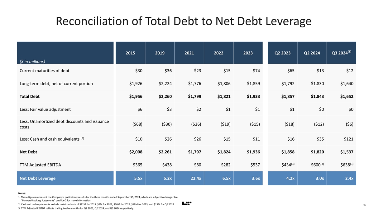 Reconciliation of Total Debt to Net Debt Leverage (1) 2015 2019 2021 2022 2023 Q2 2023 Q2 2024 Q3 2024 ($ in millions) Current maturities of debt $30 $36 $23 $15 $74 $65 $13 $12 Long-term debt, net of current portion $1,926 $2,224 $1,776 $1,806 $1,859 $1,792 $1,830 $1,640 Total Debt $1,956 $2,260 $1,799 $1,821 $1,933 $1,857 $1,843 $1,652 Less: Fair value adjustment $6 $3 $2 $1 $1 $1 $0 $0 Less: Unamortized debt discounts and issuance ($68) ($30) ($26) ($19) ($15) ($18) ($12) ($6) costs (2) Less: Cash and cash equivalents $10 $26 $26 $15 $11 $16 $35 $121 Net Debt $2,008 $2,261 $1,797 $1,824 $1,936 $1,858 $1,820 $1,537 (3) (3) (3) TTM Adjusted EBITDA $365 $438 $80 $282 $537 $434 $600 $638 Net Debt Leverage 5.5x 5.2x 22.4x 6.5x 3.6x 4.2x 3.0x 2.4x Notes: 1. These figures represent the Company’s preliminary results for the three months ended September 30, 2024, which are subject to change. See “Forward-Looking Statements” on slide 2 for more information. 2. Cash and cash equivalents exclude restricted cash of $22M for 2019, $6M for 2021, $10M for 2022, $19M for 2023, and $15M for Q2 2023. 36 3. TTM Adjusted EBITDA reflects trailing twelve months for Q2 2023, Q2 2024, and Q3 2024 respectively. 81nidZpGqzkSDMpD