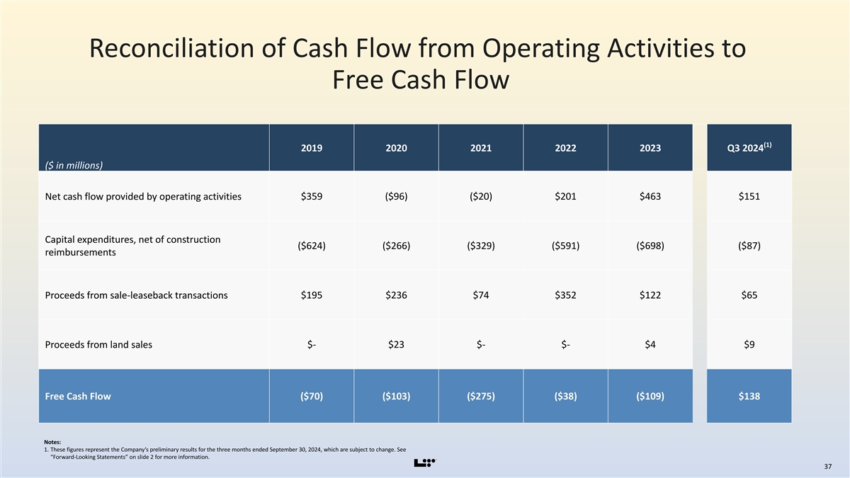 Reconciliation of Cash Flow from Operating Activities to Free Cash Flow (1) 2019 2020 2021 2022 2023 Q3 2024 ($ in millions) Net cash flow provided by operating activities $359 ($96) ($20) $201 $463 $151 Capital expenditures, net of construction ($624) ($266) ($329) ($591) ($698) ($87) reimbursements Proceeds from sale-leaseback transactions $195 $236 $74 $352 $122 $65 Proceeds from land sales $- $23 $- $- $4 $9 ($70) ($103) ($275) ($38) ($109) $138 Free Cash Flow Notes: 1. These figures represent the Company’s preliminary results for the three months ended September 30, 2024, which are subject to change. See “Forward-Looking Statements” on slide 2 for more information. 37 81nidZpGqzkSDMpD