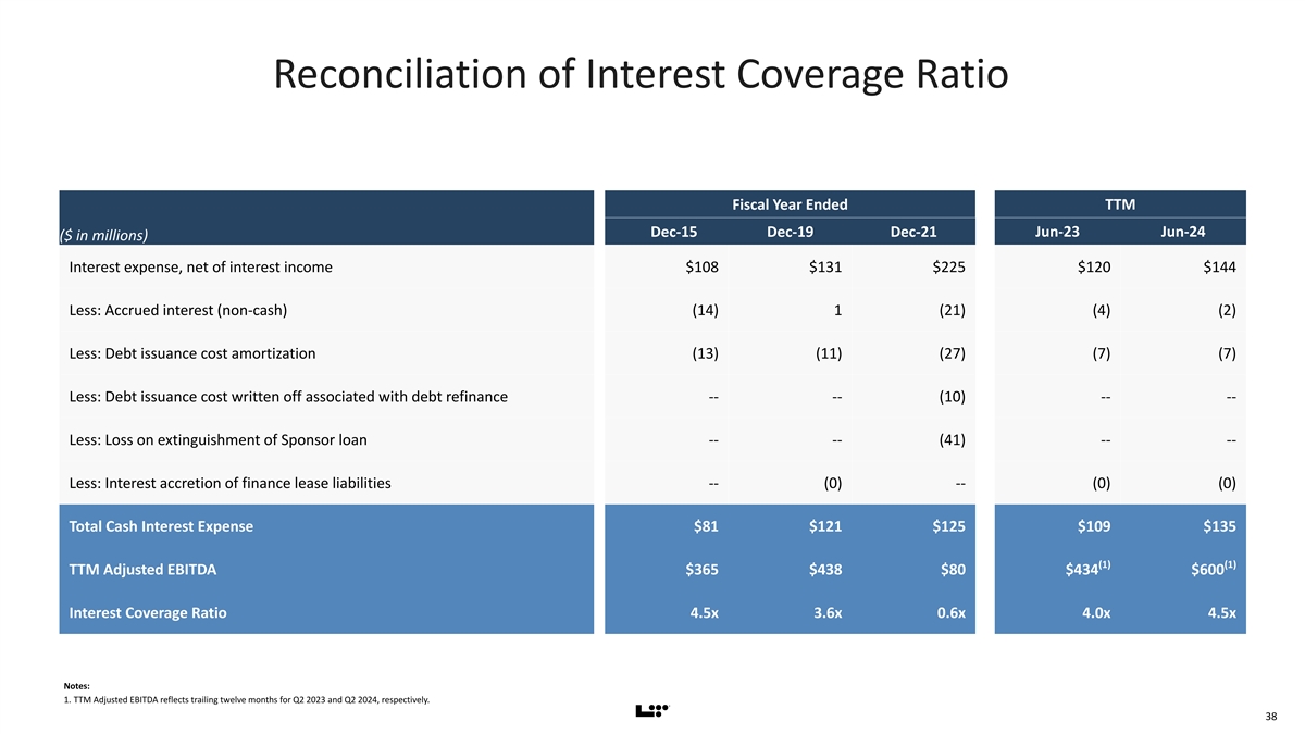 Reconciliation of Interest Coverage Ratio Fiscal Year Ended TTM Dec-15 Dec-19 Dec-21 Jun-23 Jun-24 ($ in millions) Interest expense, net of interest income $108 $131 $225 $120 $144 Less: Accrued interest (non-cash) (14) 1 (21) (4) (2) Less: Debt issuance cost amortization (13) (11) (27) (7) (7) Less: Debt issuance cost written off associated with debt refinance -- -- (10) -- -- Less: Loss on extinguishment of Sponsor loan -- -- (41) -- -- Less: Interest accretion of finance lease liabilities -- (0) -- (0) (0) Total Cash Interest Expense $81 $121 $125 $109 $135 (1) (1) TTM Adjusted EBITDA $365 $438 $80 $434 $600 Interest Coverage Ratio 4.5x 3.6x 0.6x 4.0x 4.5x Notes: 1. TTM Adjusted EBITDA reflects trailing twelve months for Q2 2023 and Q2 2024, respectively. 38 81nidZpGqzkSDMpD