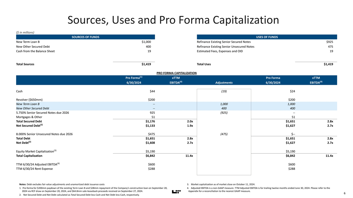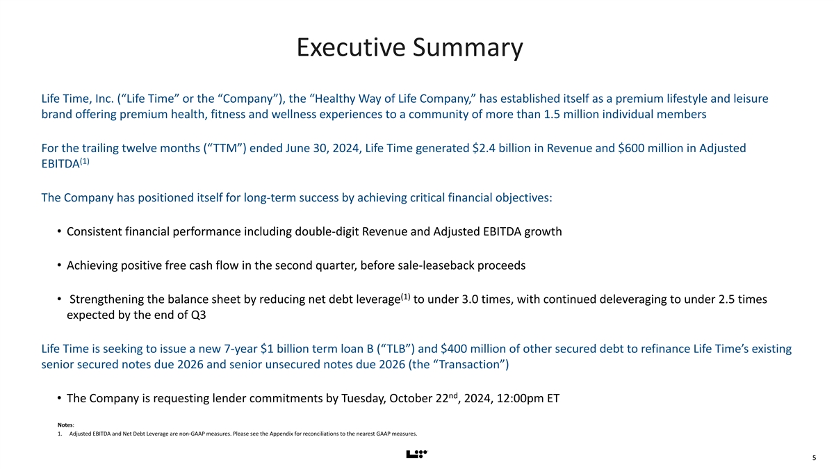 Executive Summary Life Time, Inc. (“Life Time” or the “Company”), the “Healthy Way of Life Company,” has established itself as a premium lifestyle and leisure brand offering premium health, fitness and wellness experiences to a community of more than 1.5 million individual members For the trailing twelve months (“TTM”) ended June 30, 2024, Life Time generated $2.4 billion in Revenue and $600 million in Adjusted (1) EBITDA The Company has positioned itself for long-term success by achieving critical financial objectives: • Consistent financial performance including double-digit Revenue and Adjusted EBITDA growth • Achieving positive free cash flow in the second quarter, before sale-leaseback proceeds (1) • Strengthening the balance sheet by reducing net debt leverage to under 3.0 times, with continued deleveraging to under 2.5 times expected by the end of Q3 Life Time is seeking to issue a new 7-year $1 billion term loan B (“TLB”) and $400 million of other secured debt to refinance Life Time’s existing senior secured notes due 2026 and senior unsecured notes due 2026 (the “Transaction”) nd • The Company is requesting lender commitments by Tuesday, October 22 , 2024, 12:00pm ET Notes: 1. Adjusted EBITDA and Net Debt Leverage are non-GAAP measures. Please see the Appendix for reconciliations to the nearest GAAP measures. 5 81nidZpGqzkSDMpD