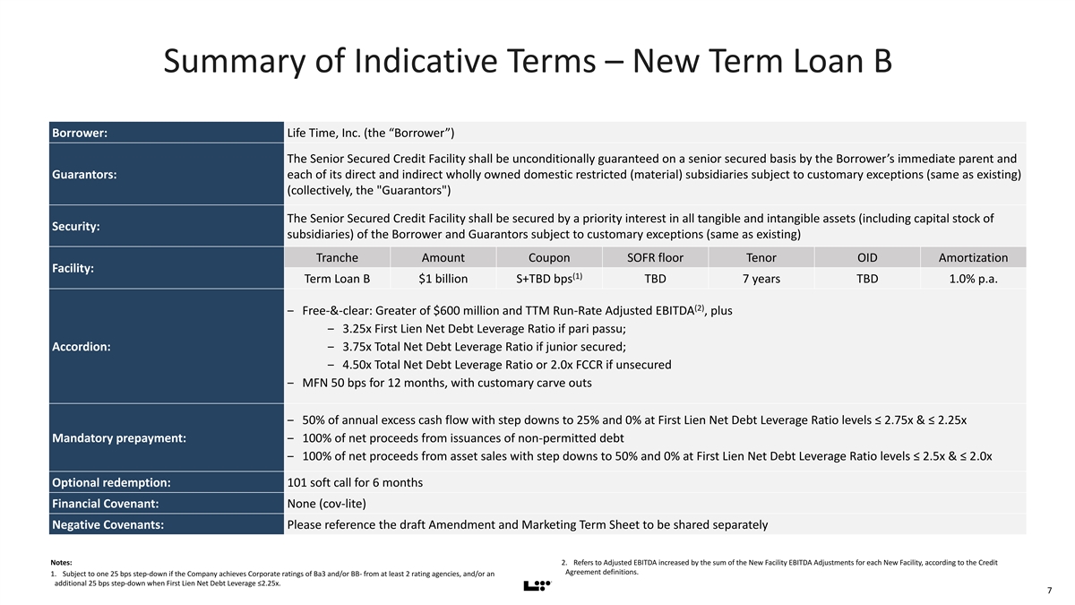 Summary of Indicative Terms – New Term Loan B Borrower: Life Time, Inc. (the “Borrower”) The Senior Secured Credit Facility shall be unconditionally guaranteed on a senior secured basis by the Borrower’s immediate parent and Guarantors: each of its direct and indirect wholly owned domestic restricted (material) subsidiaries subject to customary exceptions (same as existing) (collectively, the Guarantors ) The Senior Secured Credit Facility shall be secured by a priority interest in all tangible and intangible assets (including capital stock of Security: subsidiaries) of the Borrower and Guarantors subject to customary exceptions (same as existing) Tranche Amount Coupon SOFR floor Tenor OID Amortization Facility: (1) Term Loan B $1 billion S+TBD bps TBD 7 years TBD 1.0% p.a. (2) ‒ Free-&-clear: Greater of $600 million and TTM Run-Rate Adjusted EBITDA , plus ‒ 3.25x First Lien Net Debt Leverage Ratio if pari passu; Accordion: ‒ 3.75x Total Net Debt Leverage Ratio if junior secured; ‒ 4.50x Total Net Debt Leverage Ratio or 2.0x FCCR if unsecured ‒ MFN 50 bps for 12 months, with customary carve outs ‒ 50% of annual excess cash flow with step downs to 25% and 0% at First Lien Net Debt Leverage Ratio levels ≤ 2.75x & ≤ 2.25x Mandatory prepayment: ‒ 100% of net proceeds from issuances of non-permitted debt ‒ 100% of net proceeds from asset sales with step downs to 50% and 0% at First Lien Net Debt Leverage Ratio levels ≤ 2.5x & ≤ 2.0x Optional redemption: 101 soft call for 6 months Financial Covenant: None (cov-lite) Negative Covenants: Please reference the draft Amendment and Marketing Term Sheet to be shared separately Notes: 2. Refers to Adjusted EBITDA increased by the sum of the New Facility EBITDA Adjustments for each New Facility, according to the Credit Agreement definitions. 1. Subject to one 25 bps step-down if the Company achieves Corporate ratings of Ba3 and/or BB- from at least 2 rating agencies, and/or an additional 25 bps step-down when First Lien Net Debt Leverage ≤2.25x. 7 81nidZpGqzkSDMpD