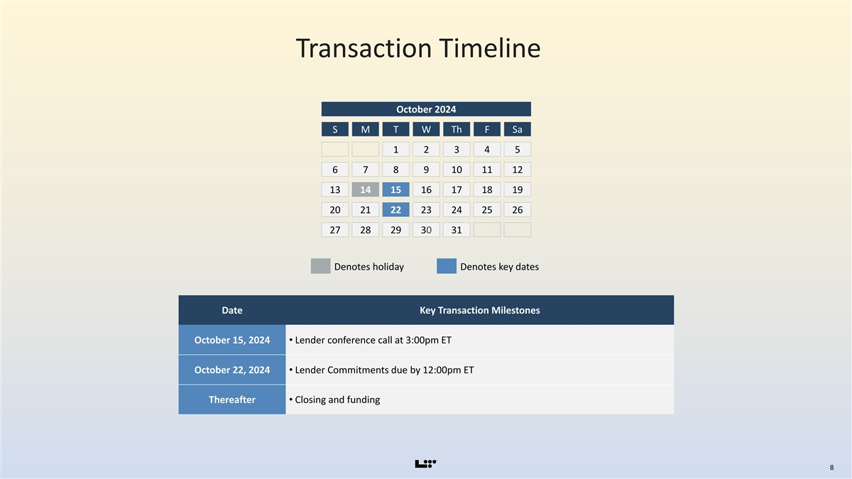 Transaction Timeline October 2024 S M T W Th F Sa 1 2 3 4 5 6 7 8 9 10 11 12 13 14 15 16 17 18 19 20 21 22 23 24 25 26 27 28 29 30 31 Denotes holiday Denotes key dates Date Key Transaction Milestones October 15, 2024• Lender conference call at 3:00pm ET October 22, 2024• Lender Commitments due by 12:00pm ET Thereafter • Closing and funding 8 81nidZpGqzkSDMpD
